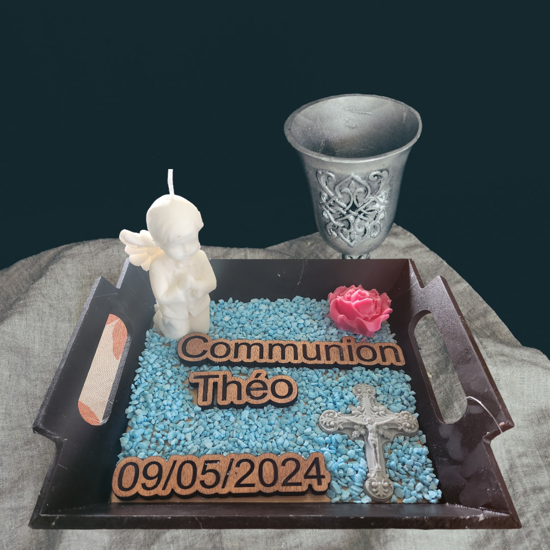 Ce plateau en bois mesure 22cm x 22cm et est spécialement conçu pour accueillir une bougie de communion pour une fille ou un garçon. Il est orné de motifs et d’éléments religieux et constitue un cadeau idéal pour célébrer ce moment important dans la vie d’un enfant. Le plateau peut être utilisé comme décoration lors de la cérémonie de communion et comme souvenir de cette occasion spéciale.